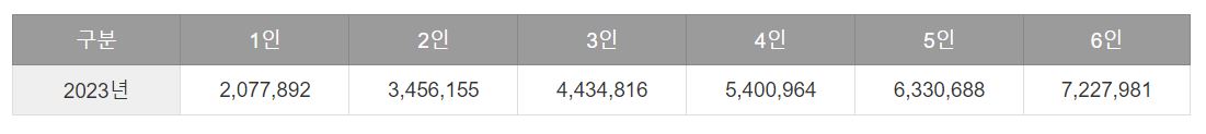 위에 보시는 표는 연도별 기준중위소득 100%입니다.